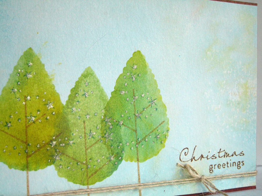 For the trees I inked the tree top stamp with crushed olive and broken china, spritzed some water before I stamped them. I stamped the star ornaments on the tree with broken china then added some shine with a glitter pen.
