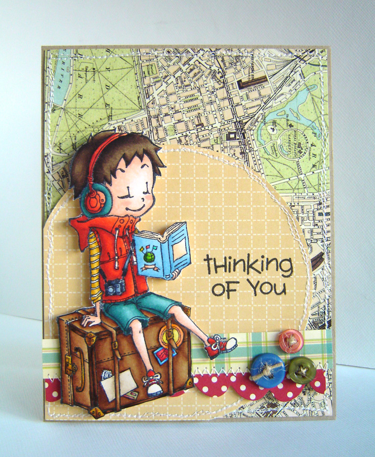 I used the lovely Traveling Josh for my card. Isn't he cute? He is so fun to color and I love his vintage suitcase!