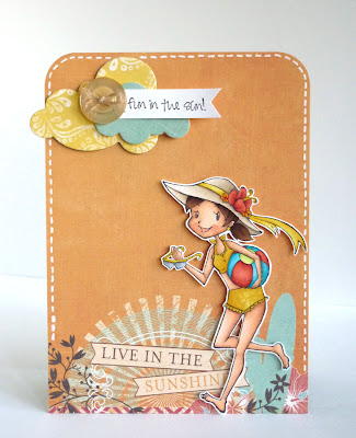 Beach Chloe is stamped on PTI's Stamper's Select White cardstock, colored mostly with Copic markers then trimmed out. I paper pieced her bathing suit then added a little shading with matching Copics.